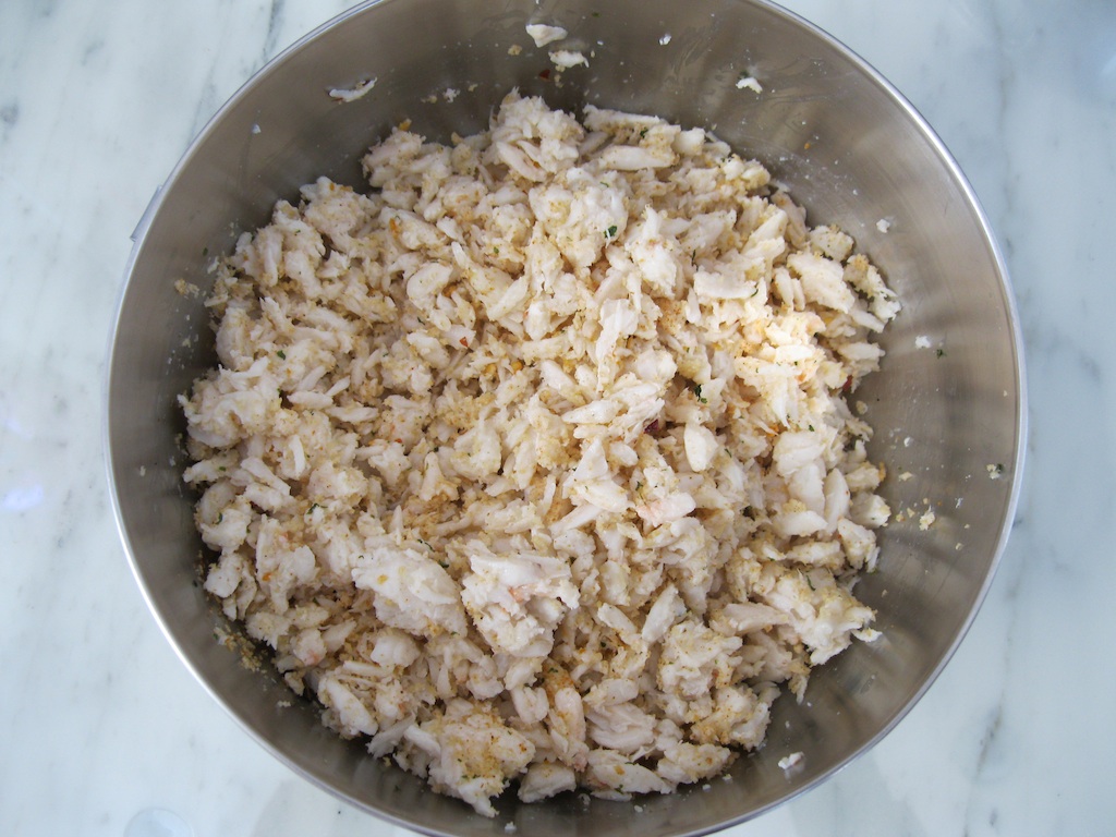 3. Transfer to a medium bowl with crab meat and bread crumbs, and fold gently to mix, being careful not to break up the lumps.